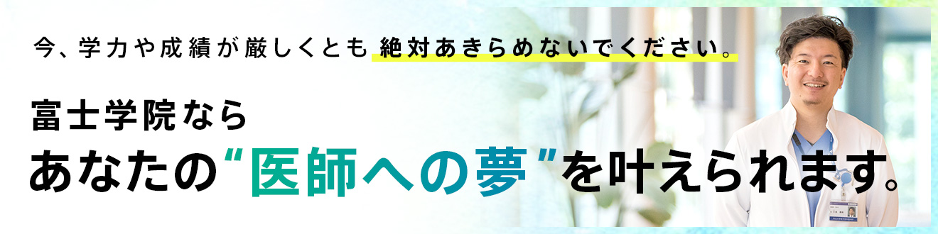 医師になりたいという気持ちさえあれば、富士学院には大勢のサポーターがいます。学力も、人としても成長を支えてくれる予備校は富士学院くらいだと思います。最終的には自分との戦いにはなりますが、支えなしに合格を掴みとることは簡単ではありません。