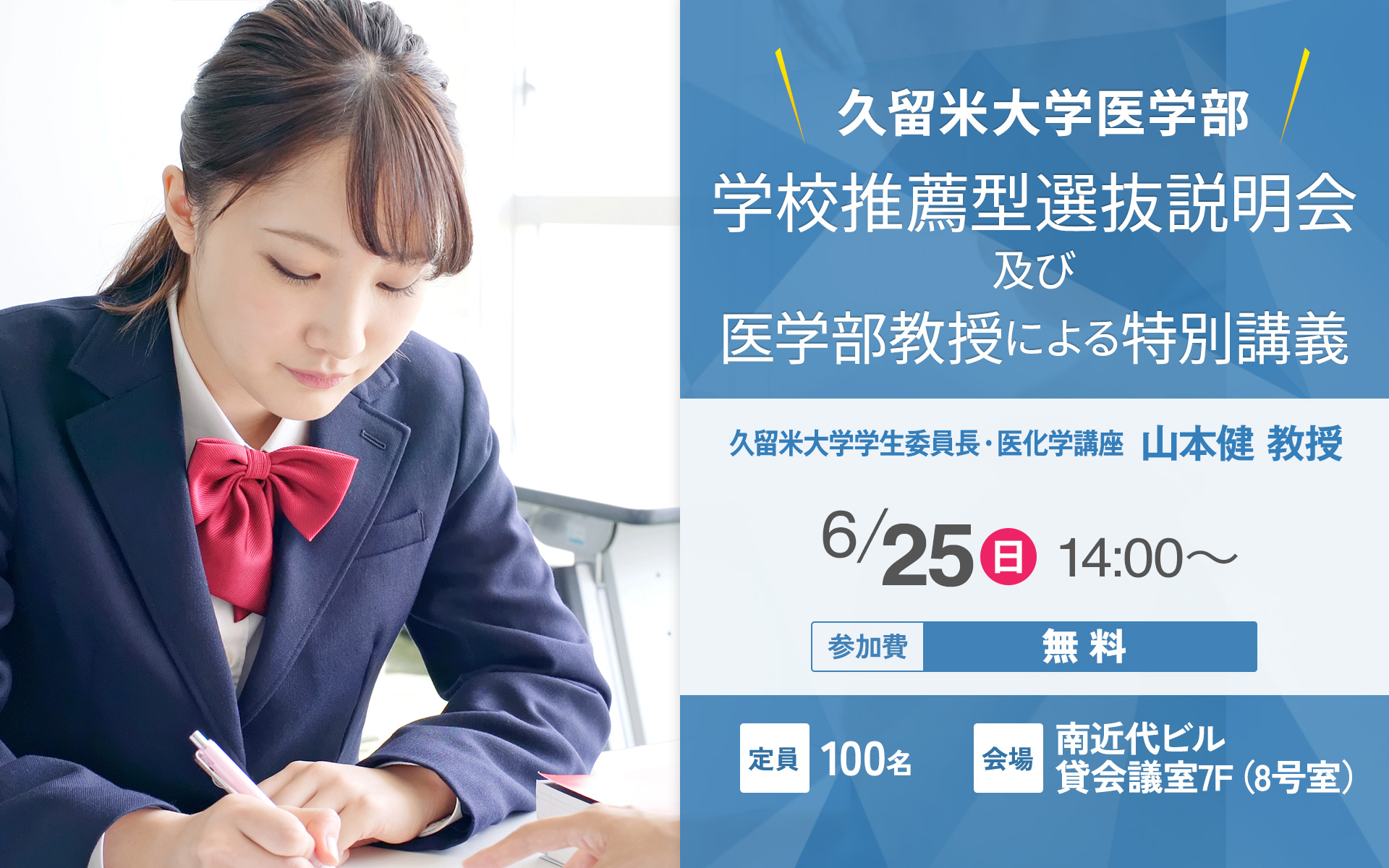 また、説明会に先立って久留米大学 学生委員長山本健教授による特別講義も行います。