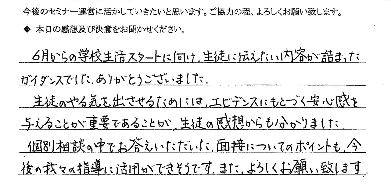 三者面談では担当講師も入って生徒・保護者と今後の指導方針を共有します。いずれも最後に生徒が決意を述べ、生徒自身が自ら頑張り、自らが前に進んでいく事ができるよう、会議や面談を行っています。