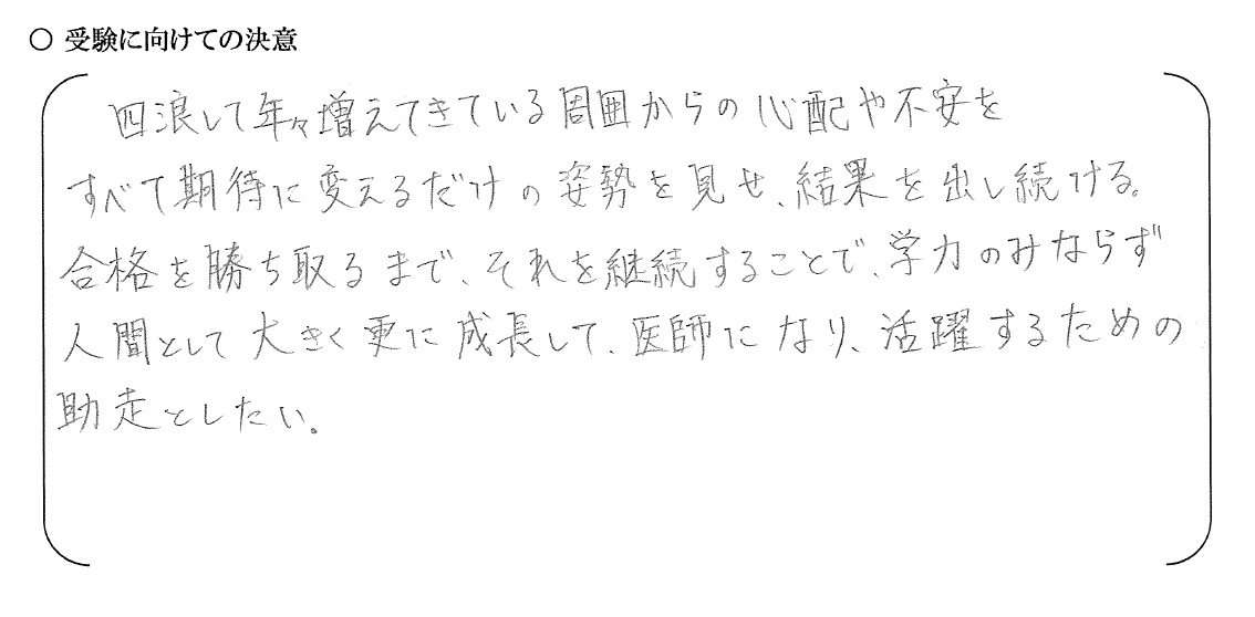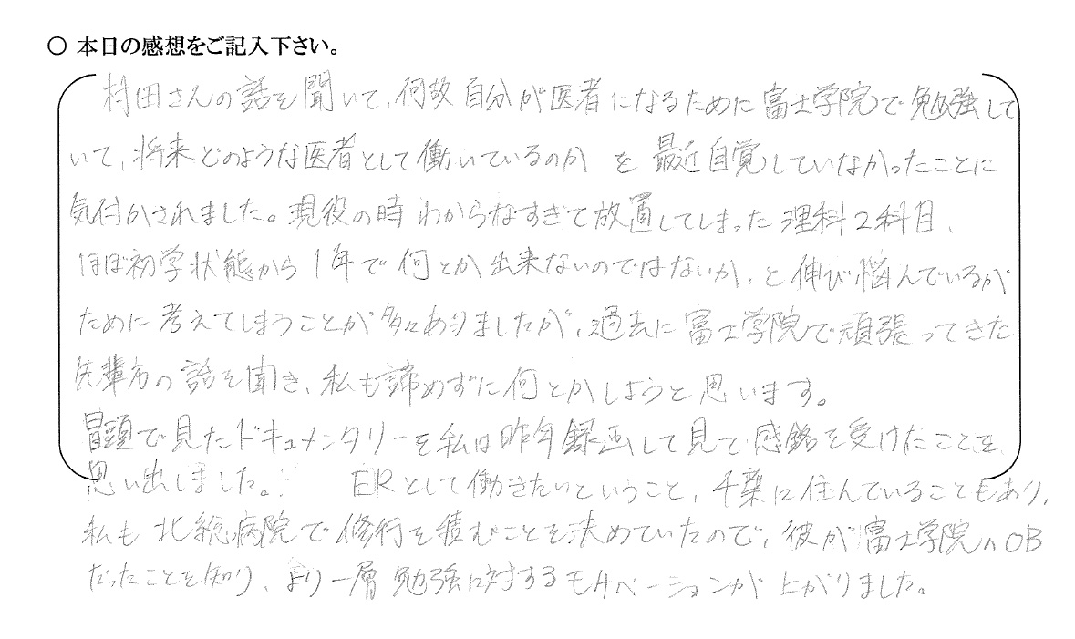 医学部受験は「医師になる」ための受験です。「医学部に入る」ことが目標となってしまうと燃え尽き症候群になり、厳しい医学教育カリキュラムに耐えることはできません。富士学院では〝何のための勉強なのか〟〝医師になるということはどういうことなのか〟など『医師になる』という自覚と覚悟を促すために年間を通し様々な取り組みを行っています。
