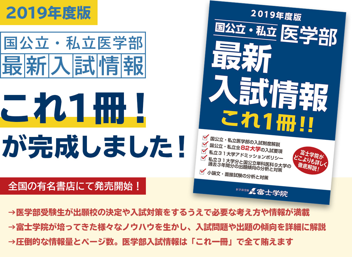 - ・2019年度版国公立・私立医学部最新入試情報「これ一冊」をお求めの方はお近くの書店又はAMAZONにてご購入ください。