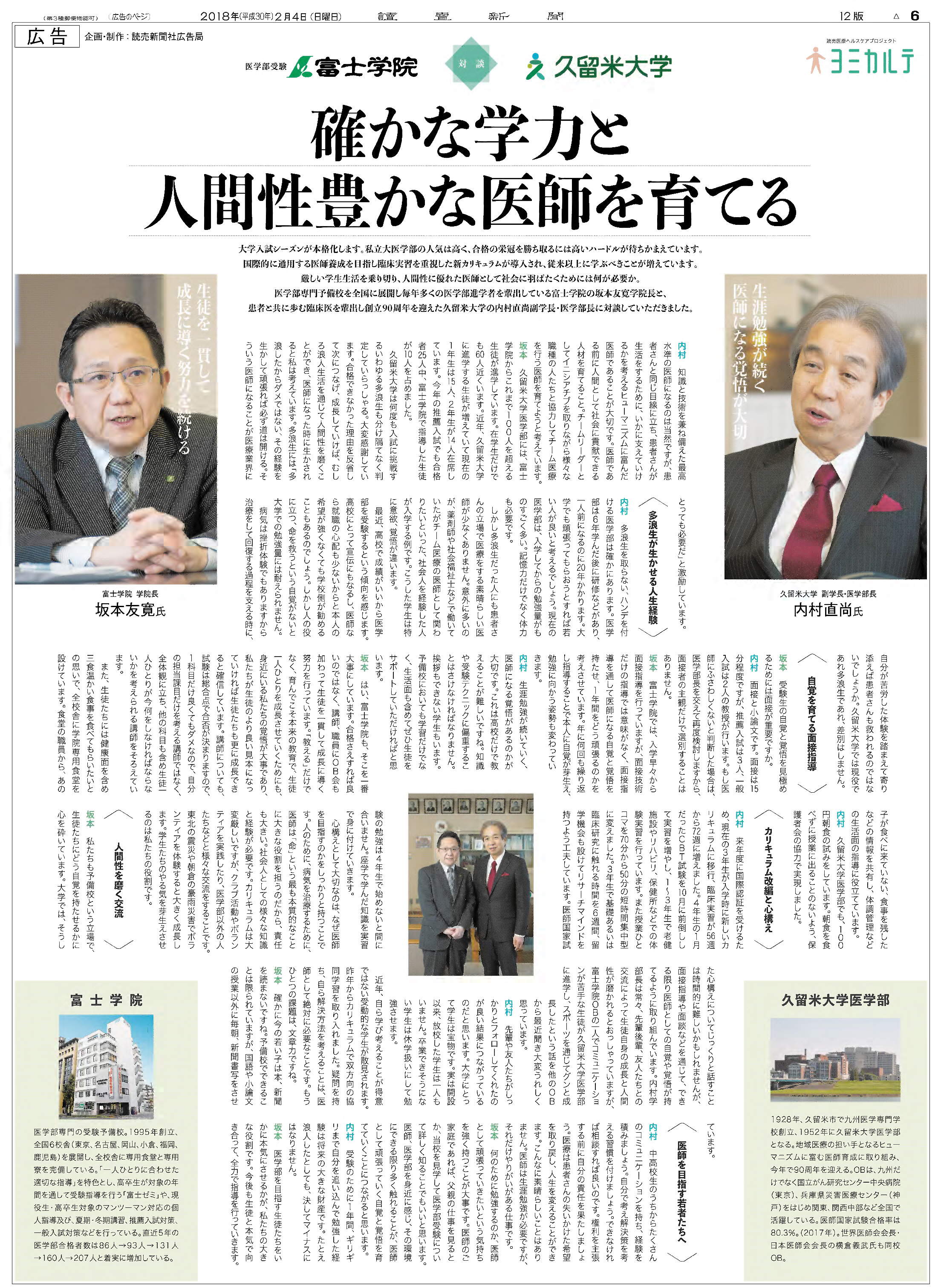 「読売新聞西部本社版2018年2月4日(日)付「ヨミカルテ」で坂本学院長と久留米大学副学長・医学部長 内村直尚先生が医師を目指す若者たちへ『確かな学力と人間性豊かな医師を育てる』というテーマで対談を行い、その内容が掲載されました。