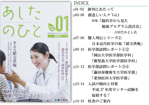 さて、富士学院では開校20周年を記念して、医学部を目指す生徒や保護者のための医学部合格へのサポート情報誌「あしたのひと」を創刊致しました。今回、発刊する「あしたのひと」は、医学部合格を目指して頑張っている受験生にエールを送るマガジンとして、若者たちの医師にならんとする志を高め、難関を乗り越えるモチベーション維持の源泉にするとともに、今後の医療業界を支えていく“良い医師”を育むことにつながる、刺激と感動に満ちた幅広いアングルからの、体温のある情報発信を目指します。今後は、年に3回のペースで発刊を予定していますので、今後とも宜しくお願い申しあげます。 尚、医学部訪問レポートは毎号、国公立2大学、私立2大学を掲載していく予定です。