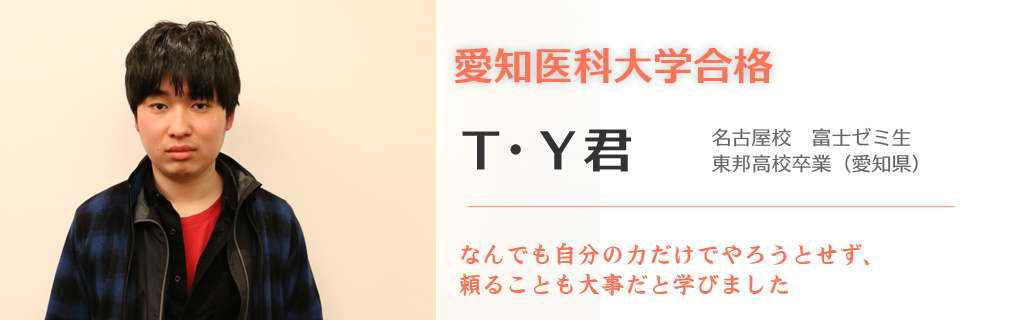 富士学院での1年を通して、勉強は何でもかんでも自分の力だけでやろうとするのではなく、必要に応じて先生をはじめ、他の人に助けを求めることも大事だと学びました。質問や相談は、積極的にすればするほど良いと感じています。私はいつも、将来必ず医師になる、そのために医学部に合格するという目標を忘れずに勉強に取り組んでいました。同時に、医学部に合格したら、浪人生活で封印してきた楽しみを解禁する、新しいものを買うといった野望を持って勉強をしていました。また、息抜きで音楽を聴くこともよくしていました。受験生の皆さん、1年は短いですが焦ることなく、やるべきことは教科ごとにある程度絞って進めていくのが良いと思います。自分の経験からも、あれこれ手を出すと中途半端になってしまうと感じています。また、心が折れてしまってはいけません。心が折れそうになったら、プレッシャーにならない程度の目標を立てたり、野望を持って下さい。これを行えば、一時的にでもモチベーションが上がるかもしれません。それでも駄目なら、先生や教務に頼りましょう。合格に向かって、頑張って下さい。